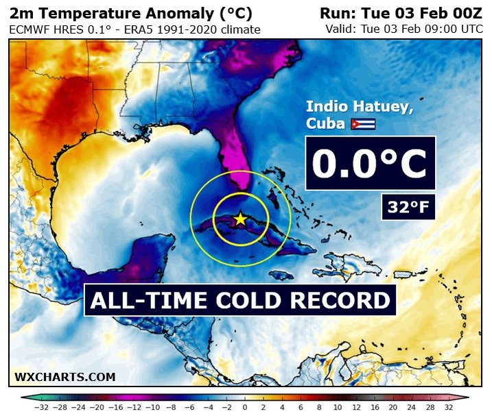 Куба впервые достигла точки замерзания На Кубе зафиксирован беспрецедентный температурный рекорд: утром на метеостанции Индьо-Атуэй температура опустилась до 0,0 °C (32 °F). Это первый случай в истории метеонаблюдений, когда страна официально достигла точки замерзания, что стало настоящим шоком для тропического острова, известного своим тёплым климатом. Аномальное похолодание уже вызвало широкий резонанс и обсуждения причин столь резкого отклонения от климатической нормы ибо считалось ранее невозможным. #Куба #Погода #Климат #Рекорд #Аномалия #ГлобальноеПотепление ✈️ Будь с нами - поделись с друзьями: Хвитторная