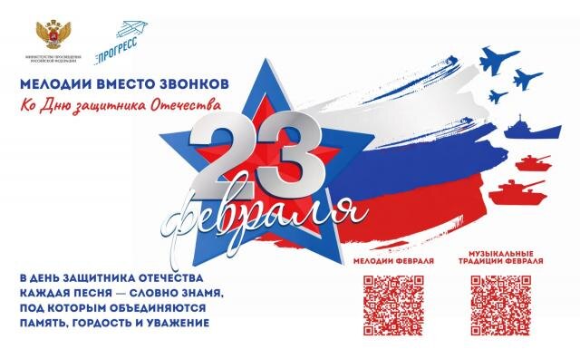 В феврале на перемены будут звать музыкальные композиции, посвященные Дню защитника Отечества. Как сообщает Минпросвещения РФ, вместо привычных звонков тишину школьных коридоров нарушат песни «Защитники России» Елены Обуховой в исполнении Ольги Быковой, «На побывку едет молодой моряк», написанная Виктором Боковым и Александром Аверкиным, но ставшая одной из самых узнаваемых в репертуаре Людмилы Зыкинов, «Экипаж - одна семья» Юрия Погорельского и Виктора Плешака, когда-то прогремевшая, благодаря ВИА «Самоцветы», а также «Я голосую за жизнь» Дениса Майданова, которую автор представил однажды вместе с Хором Первых и детским музыкальным театром «Домисолька». Подборка приурочена и к двум другим праздникам: ко Дню разгроманемецко-фашистских войск в Сталинградской битве, отмечаемому ежегодно всей страной и особенной Волгоградской областью 2 февраля, и грядущему Дню российской науки (8 февраля). По словам организаторов проекта, реализуемого Центром всестороннего развития детей «Прогресс» при п