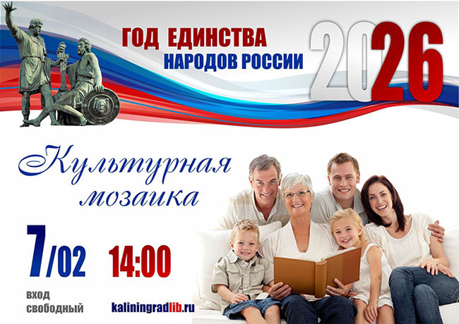 7 февраля, с 14.00 в «Чеховке» стартует познавательно-развлекательная программа для всей семьи «Культурная мозаика»,приуроченная к открытию Года единства народов РФ. Гостей ждут разнообразные занятия. Для детей от 6 лет организуют специальный уголок с показом мультфильмов фестиваля «Суздальфест». Запланированы мастер-классы, литературные и интеллектуальные игры, а также дефиле Театра моды русского костюма. Намечены и выступления творческих коллективов национальных автономий от «Дома Дружбы». Полную программу «Культурной мозаики» смотрите на сайте: kaliningradlib.ru/node/19783 Место проведения : г. Калининград, Центральная городская библиотека им. А. П. Чехова (Московский пр-т, 39)