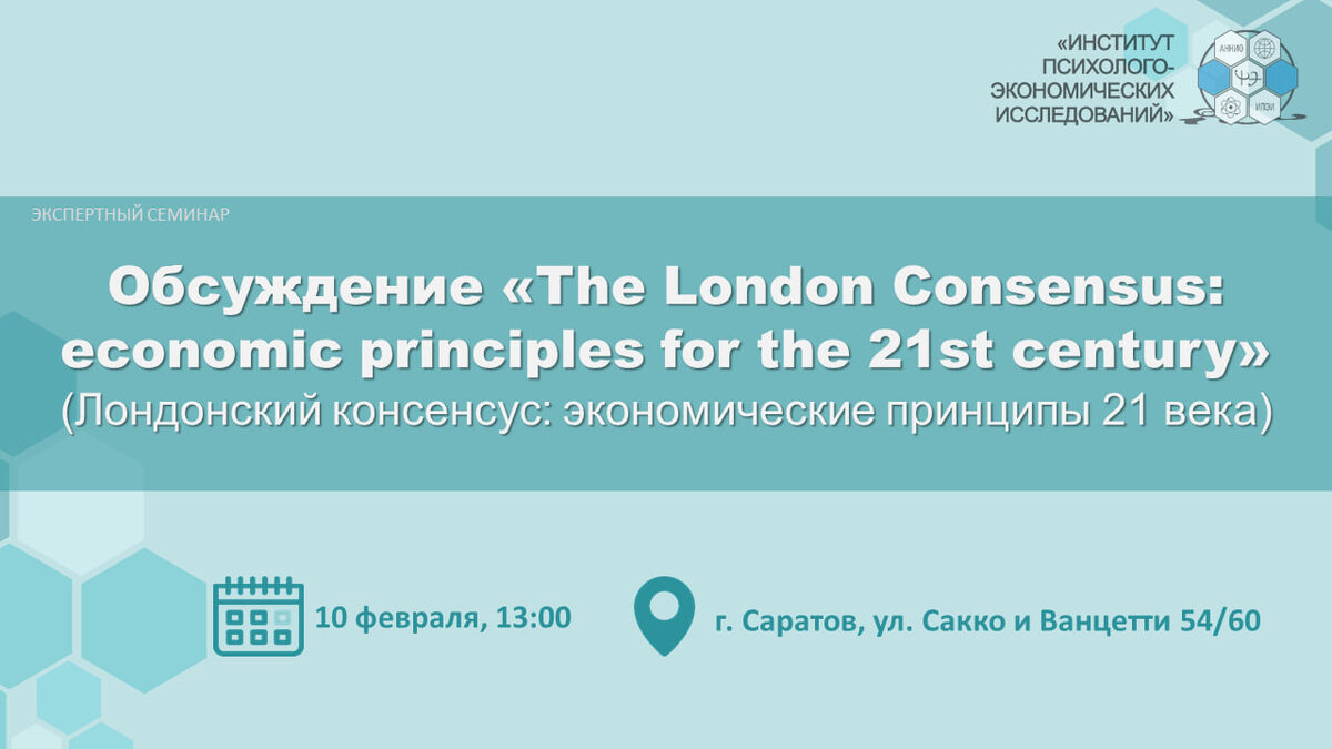 10 февраля 2026 года в Институте психолого-экономических исследований пройдёт экспертный семинар ко Дню Российской науки. Мероприятие будет посвящено обсуждению "The London Consensus: economic principles for the 21st century" (Лондонский консенсус: экономические принципы 21 века) Приглашаем желающих принять участие в работе семинара. Количество мест ограничено. Участие платное! Когда:10 февраля 13:00(по саратовскому времени) Где:г. Саратов, ул. Сакко и Ванцетти 54/60 Для участия в качестве слушателя необходимо заполнить регистрационную анкету и отправить её на почту ipei@ipei.ru до 6 февраля 15:00. ❗️Количество мест - 10 Для участия в ходе обсуждения необходимо: 1. Заполнить регистрационную анкету 2. Прочитать приложенный фрагмент книги и написать эссе (объёмом 2-3 страницы А4) с размышлениями о прочитанном. 3.Отправить заполненную регистрационную анкету и эссе, на электронную почту ipei@ipei.ru до 8 февраля 2026 года 16:00. ❗️Количество мест - 5