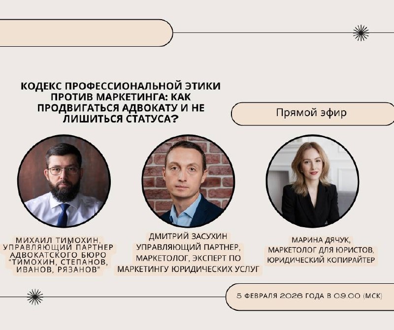 ? Кодекс профессиональной этики против маркетинга: как продвигаться адвокату и не лишиться статуса 🌱 Продвижение адвоката — зона повышенного риска. В отличие от юристов, адвокат связан требованиями Кодекса профессиональной этики, которые ограничивают способы позиционирования и самопрезентации. Кодекс допускает распространение информации об адвокате и адвокатском образовании, но запрещает: 🦞 использование оценочных характеристик; 🦞 сравнение себя с другими адвокатами; 🦞 критику коллег. На практике эти ограничения нередко нарушаются — иногда осознанно, но чаще по незнанию. Маркетолог, копирайтер или SMM-специалист работают по «общим» правилам продвижения, а адвокат не всегда контролирует итоговый контент. Мы решили провести эфир в формате живой дискуссии с адвокатом, чтобы разговор получился максимально разносторонним — не только с точки зрения маркетинга, но и с позиции профессиональной ответственности и адвокатской практики. В прямом эфире разберем: ▫️ насколько реальна угро