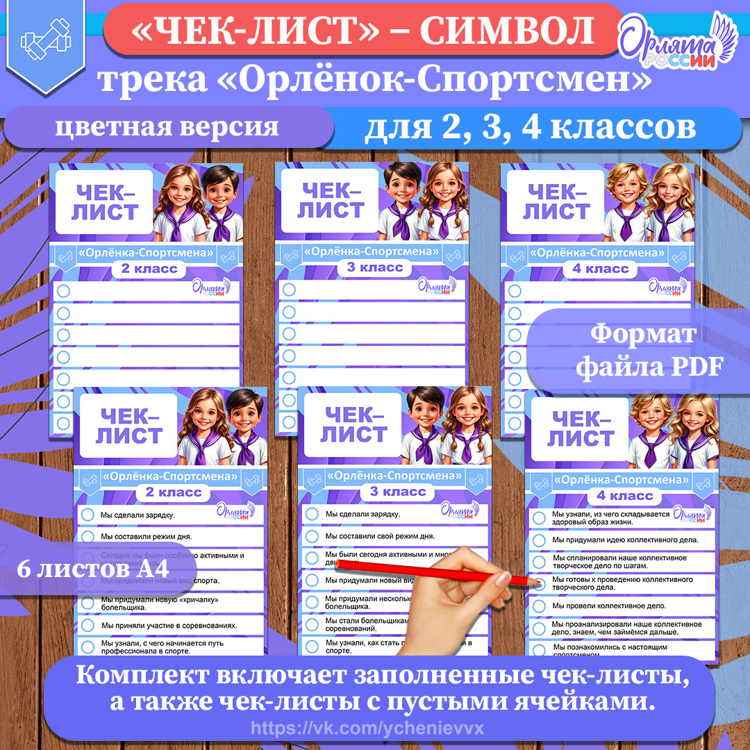 ❗❗ Данный комплект "Чек-листов" к треку "Орлёнок-Спортсмен" можно скачать здесь. ❗❗ 📄 «Чек-лист» – символ трека «Орлёнок-Спортсмен» «Орлята России». В комплекте представлены несколько вариантов чек-листов: 1. Для 2 класса (заполнен, нужно выполнять задания в течение трека и отмечать галочками); 2. Для 3 класса (заполнен, нужно выполнять задания в течение трека и отмечать галочками); 3. Для 4 класса (заполнен, нужно выполнять задания в течение трека и отмечать галочками); 4. Для 2 класса (с пустыми окошками для самостоятельного заполнения); 5. Для 3 класса (с пустыми окошками для самостоятельного заполнения); 6. Для 4 класса (с пустыми окошками для самостоятельного заполнения). 📄 Материал доступен для скачивания в PDF формате. Всего в комплекте 6 листов А4. ✍Чек‑лист делает трек наглядным и игровым: • превращает рутину в квест; • даёт ощущение достижения при отметке выполненного; • учит планировать и доводить дела до конца; • поддерживает мотивацию через визуальную фиксацию успехов.