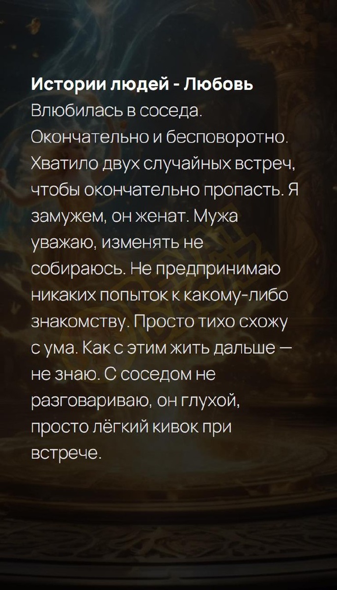 Истории людей - Любовь Влюбилась в соседа. Окончательно и бесповоротно. Хватило двух случайных встреч, чтобы окончательно пропасть. Я замужем, он женат. Мужа уважаю, изменять не собираюсь. Не предпринимаю никаких попыток к какому-либо знакомству. Просто тихо схожу с ума. Как с этим жить дальше — не знаю. С соседом не разговариваю, он глухой, просто лёгкий кивок при встрече. #добро #помощьближнему #мудрость #добробезграниц #приоритеты #история #душевныерассказы #PROжизнь #человекчеловеку #добро #помощьближнему #мудрость #добробезграниц #приоритеты #история #душевныерассказы #PROжизнь #человекчеловеку Архитектура вашей души | Ваш Ангел и Демон T | VK | Pin | YouTub | Dzen Истории людей - Любовь Влюбилась в соседа. Окончательно… #4число #4февраля