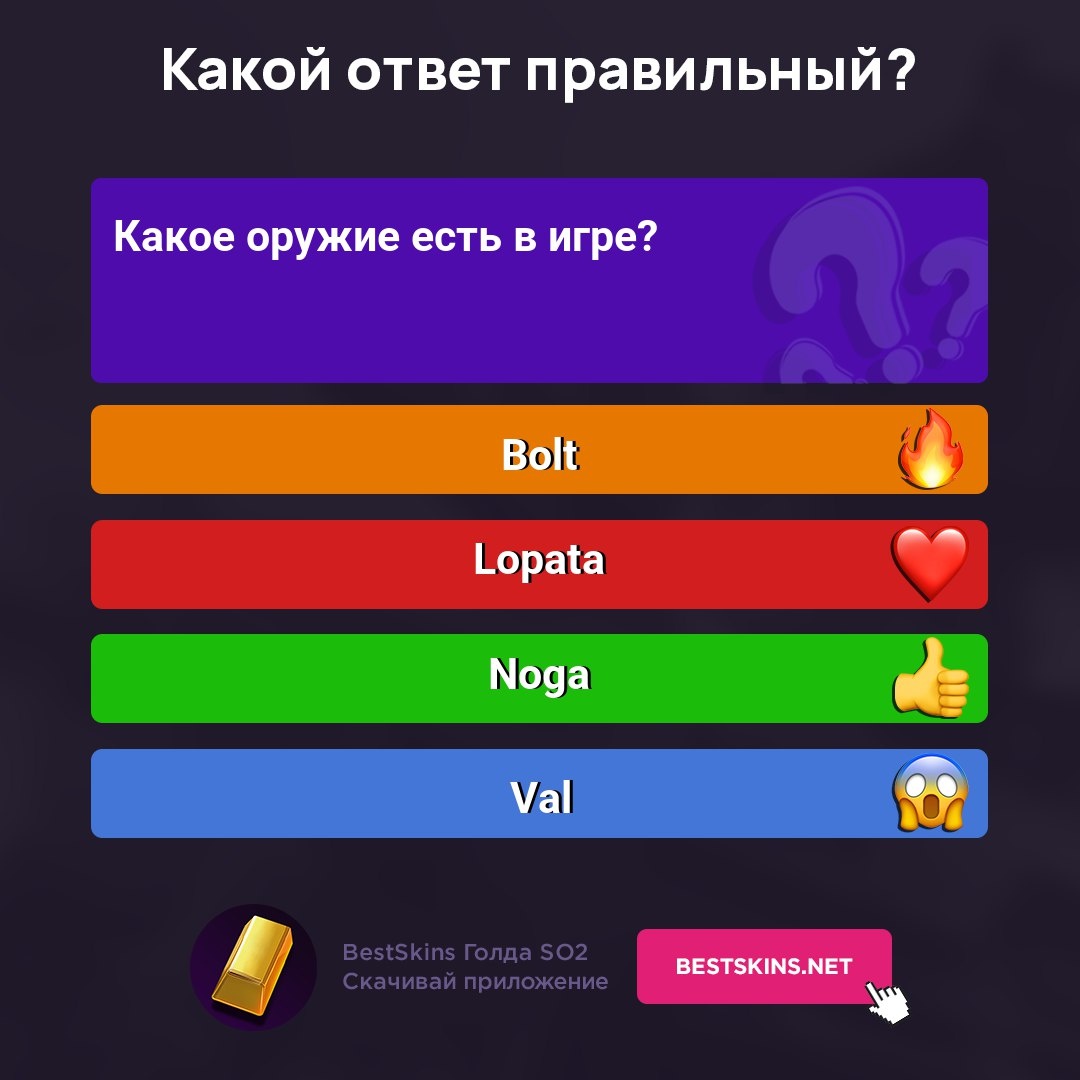 Отвечай на вопросы и фарми голду! Выбери ответ — ставь реакцию: 🔥 ❤️ 👍 😱 📲 Скачать - https://bestskins.net