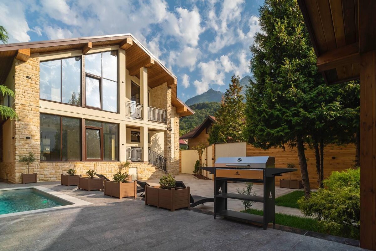 В Эсто-Садке, в самом сердце горного курорта, представлен частный дом в формате альпийского шале — редкое сочетание центральной локации и приватного пространства. В пешей доступности — Marriott, казино, набережная «Горки Город», рестораны и канатные дороги, что делает объект удобным как для постоянного проживания, так и для сезонного использования. Общая площадь дома — 369 кв. м. Планировочное решение ориентировано на комфортную жизнь и приём гостей: светлая кухня-гостиная, 3 мастер-спальни с собственными санузлами и балконами, кабинет или дополнительная спальня на первом уровне. На –1 этаже размещены сауна, фитнес-зона и технические помещения. Дом построен с использованием натуральных материалов — камень, гранит, дерево. Панорамные окна, центральные коммуникации, система «умный дом» и видеонаблюдение формируют современный уровень комфорта. Внутренняя отделка выполнена в формате White Box, что позволяет адаптировать интерьер под индивидуальный стиль. Участок 6 соток благоустроен и г