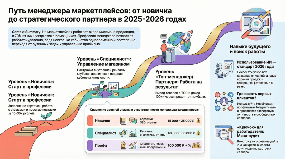Профессия менеджера маркетплейсов в 2025 году — это не просто заполнение таблиц, а роль «правой руки» предпринимателя, позволяющая зарабатывать удаленно из любой точки мира,. Спрос огромен: около 70% селлеров нуждаются в помощниках, так как сами не успевают заниматься операционкой. Что делает менеджер? (От рутины до стратегии) Обязанности растут вместе с вашим уровнем: 1. Новичок (Контент и общение): Создание и заполнение карточек товара (описание, SEO, загрузка фото), ответы на отзывы и вопросы покупателей,. Это база, которую можно освоить за пару дней. 2. Специалист (Логистика): Управление поставками (FBO/FBS), контроль остатков на складах, создание штрихкодов и пропусков для водителей,,. 3. Профи (Продвижение и Аналитика): Настройка внутренней рекламы, работа с юнит-экономикой, анализ конкурентов, ABC-анализ и финансовые отчеты,,. В 2026 году важно использовать искусственный интеллект (например, ChatGPT) для анализа воронок продаж и генерации контента — это выделяет вас среди конкур