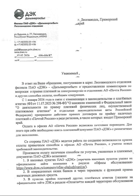 ⚡️ Оплата электричества: ДЭК прислал официальный ответ. Проще не стало? Помните наш пост о том, что старшее поколение жителей фактически лишили удобной оплаты квитанций через «Почту России»? Мы получили официальное разъяснение от Лесозаводского отделения «Дальэнергосбыта». Что говорят энергетики: 📍 Почему всё сломалось? С 1 января 2026 года вступили в силу изменения в законе о платежных агентах (ФЗ № 298). Из-за этого прямые договоры с «Почтой России» в Приморье были прекращены. 📍 Как теперь платить на почте? Привычный «прием платежа» больше не работает. Теперь это оформляется как почтовый перевод. ⚠️ Важно: Для этого нужно иметь при себе бумажную квитанцию со всеми реквизитами ПАО «ДЭК». 📍 Где еще можно оплатить наличными в Лесозаводске? Если почта теперь — это сложно и долго, ДЭК предлагает альтернативы: Кассовые пункты самого ДЭК Операционные окна и терминалы банков. Пункты других платежных агентов. 📍 Дистанционные способы (для тех, кто «на ты» с техникой): Тут без из