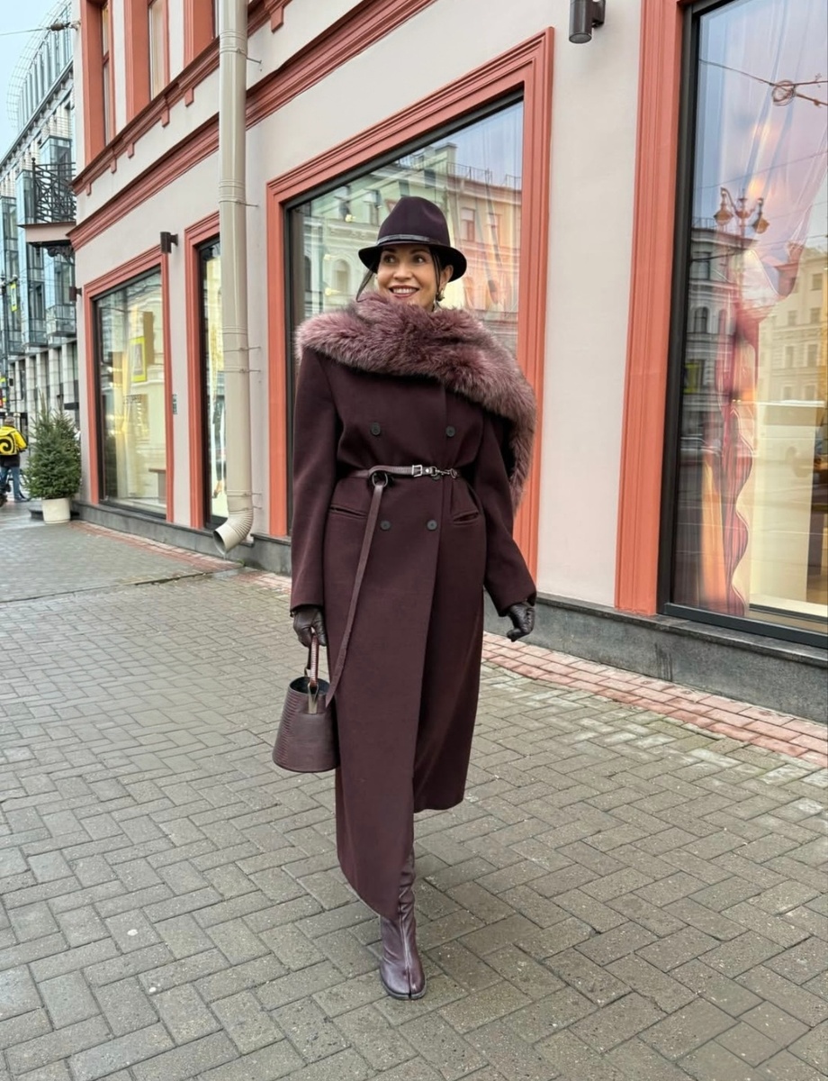Съёмный меховой воротник - роскошный акцент! Мех очень актуален в 2026 году, поэтому присмотритесь к такому виду аксессуаров. Фетровая шляпа добавляет образу лёгкого ретро-настроения и визуально собирает весь комплект, делая его законченным. Обувь и сумка - обязательно без лишнего декора.