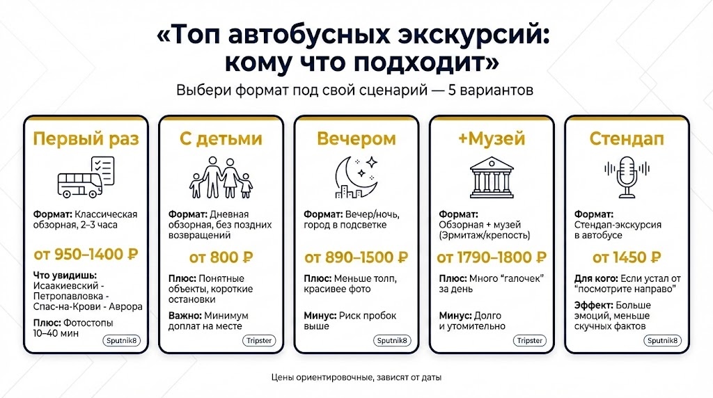 Ты покупаешь билет на «Большую обзорную по центру города». Маршрут выглядит идеально: Невский проспект, Дворцовая площадь, Исаакиевский собор, Петропавловская крепость, крейсер «Аврора», Спас на Крови.