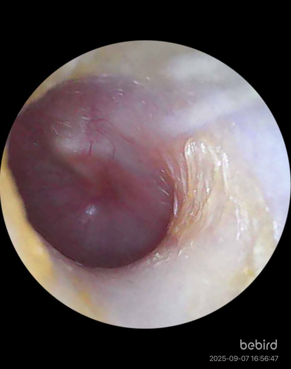 Вот так выглядит барабанная перепонка при жидкости в среднем ухе ребёнка из-за аденоидов