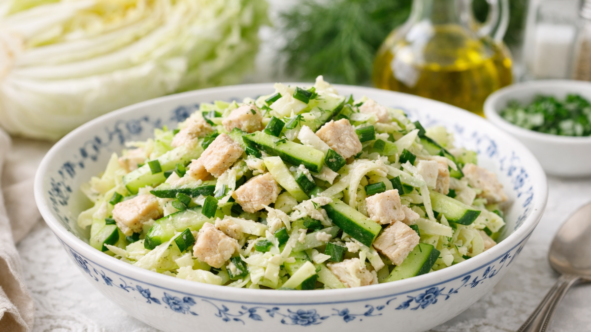 🥗 Салат из пекинской капусты с курицей и огурцом — быстрый и сытный (простой рецепт)