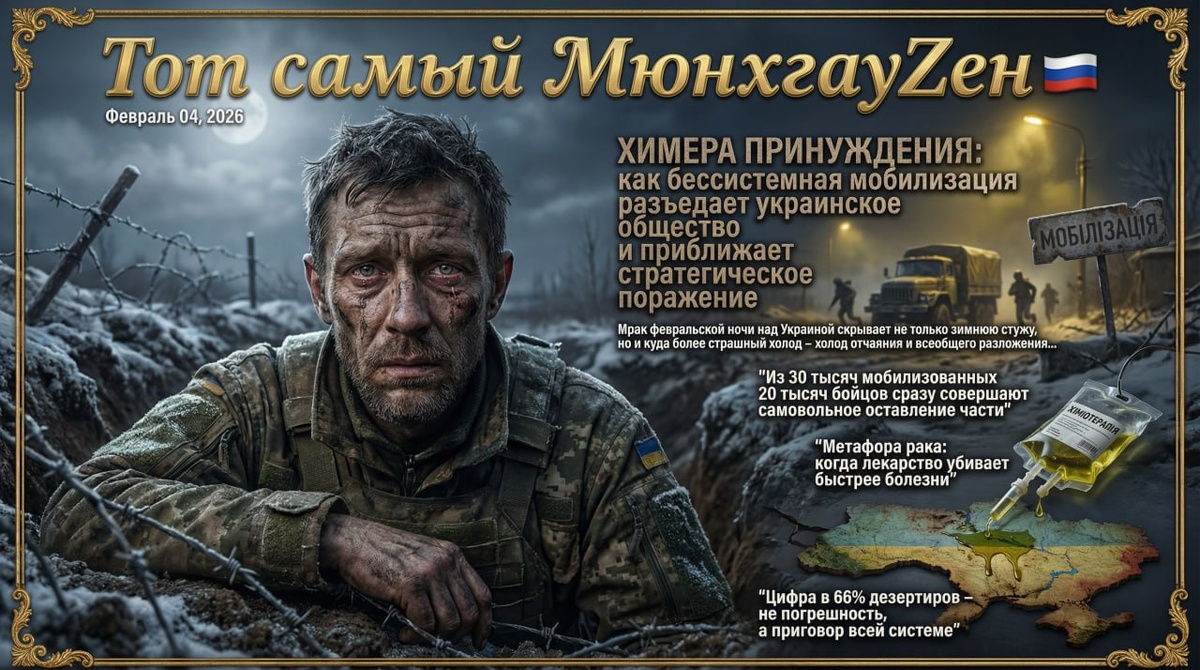 🚨 Химера принуждения: как бессистемная мобилизация разъедает украинское общество и приближает стратегическое поражение - Часть 3️⃣/3 🔹 Анализ дальнейшего развития: три круга ада Куда приведёт эта самоубийственная спираль? Прогноз очевиден и суров. Первый круг (тактический): Фронт будет держаться лишь на жесточайшем заградотрядном терроре и на контингенте, не имеющем физической возможности дезертировать. Качество войск будет неуклонно падать, потери – расти в геометрической прогрессии. Каждое новое «мобилизационное усилие» будет давать всё меньший и менее качественный «выхлоп», ещё больше разъедая тыл. Второй круг (социальный): В стране, где из каждых трёх призванных двое бегут, а третий идёт на убой, вызревает социальный взрыв невиданной силы. Дезертиры становятся внутренней угрозой, формируя вооружённые криминальные группы. Родственники погибших и искалеченных «косых и кривых» будут питать лютую ненависть к власти, доведшей их сыновей и мужей до такого состояния. Третий круг (стра