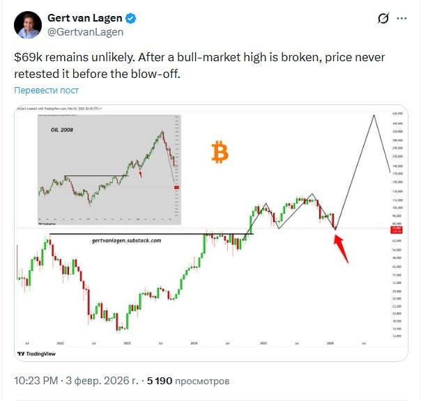 $69 тыс по-прежнему выглядит маловероятным. После того как максимум бычьего рынка был пробит, цена ни разу не возвращалась к нему перед финальной фазой резкого роста (blow-off).