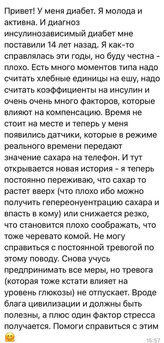 ? Первое, что мне хочется сказать при прочтении этого сообщения, что ты большая молодец. Ты справляешься с диагнозом уже 14 лет, при этом, оставаясь активной. Это очень важно заметить и присвоить для уменьшения тревоги - у тебя уже все получается. Психологическая работа с любым диагнозом начинается с принятия - теперь я живу вот так: с такими-то ограничениями, при этом с такими-то возможностями. Важно научиться не катастрофизировать, а осознать, что диабет - это управляемая часть жизни и управляешь ей ты. Возвращаемся к пункту один - ты уже делаешь это хорошо. Ты много лет отслеживала свое состояние без датчиков, ориентируясь на внутреннее состояние, симптомы и соблюдая правильный режим. Теперь у тебя есть помощник и с ним нужно подружиться, чтобы он облегчал жизнь, а не добавлял тревоги. А это уже вопрос навыков, которые ты точно сможешь приобрести. С точки зрения прикладных вещей: • сравнивай показания датчика со своими реальными ощущениями в момент времени - есть ли какие-то си