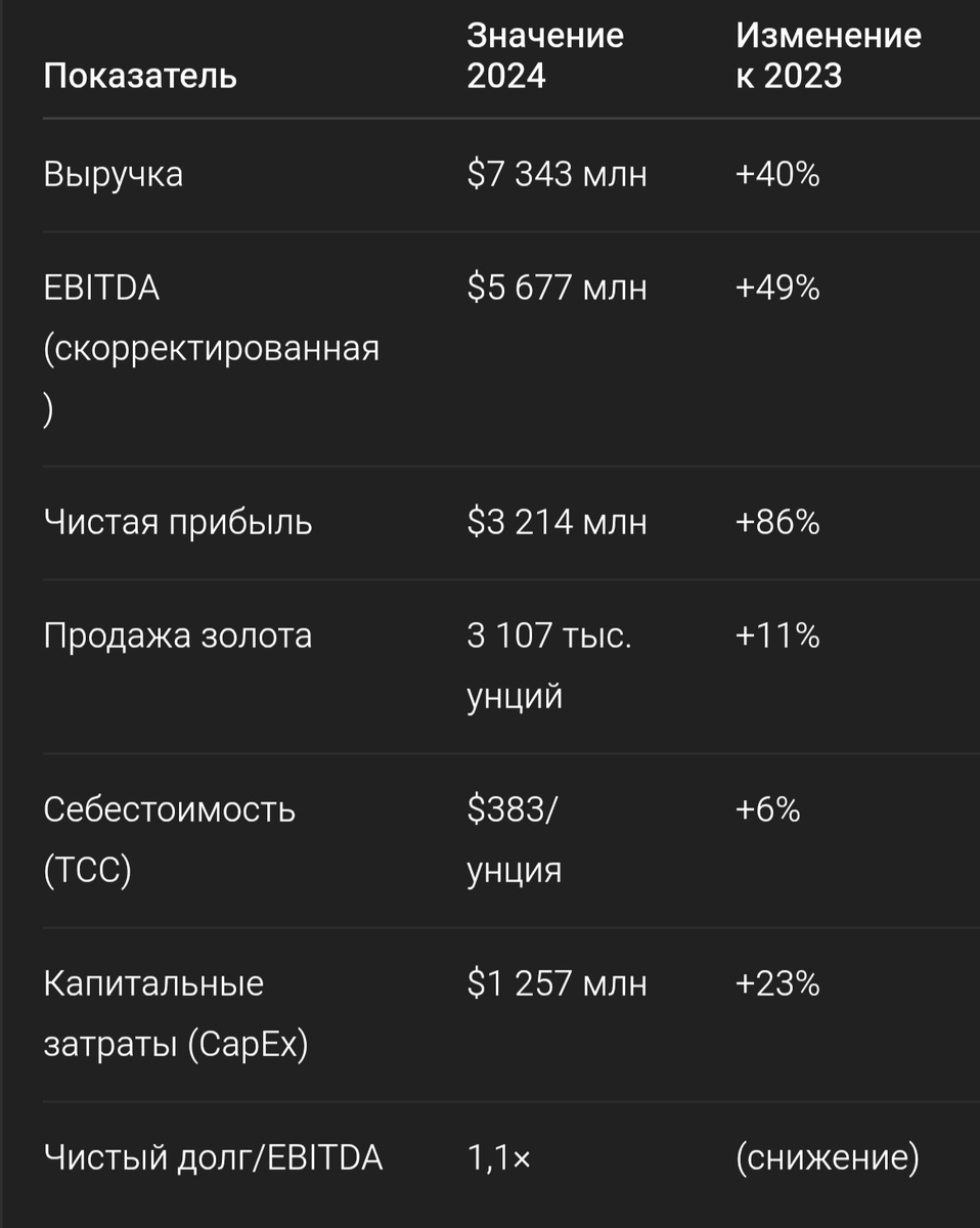 Сильные результаты 2024 г. «Полюс» закрепил статус лидера отрасли: выручка и прибыль выросли на десятки процентов, маржинальность на рекордном уровне благодаря очень низкому TCC.