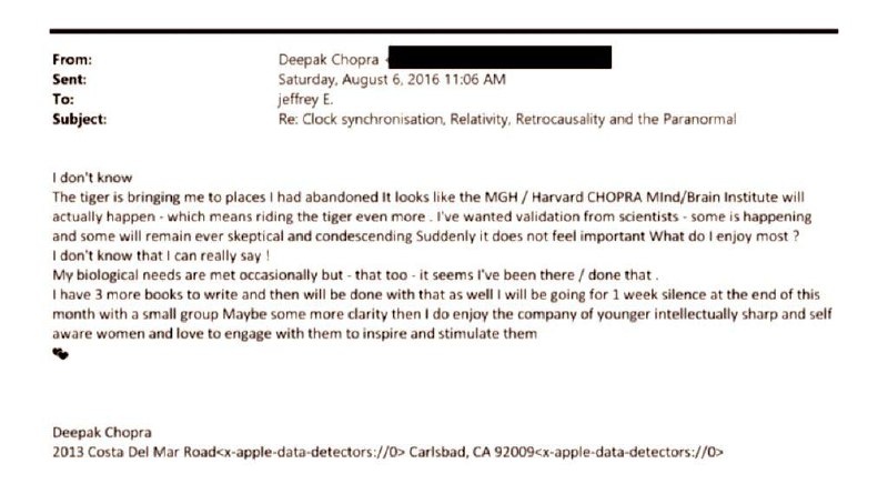 My biological needs are MET occasionally — CHOPRA TO EPSTEIN ‘I do enjoy the company of YOUNGER intellectually sharp and self aware women and love to engage them to inspire and STIMULATE them’
