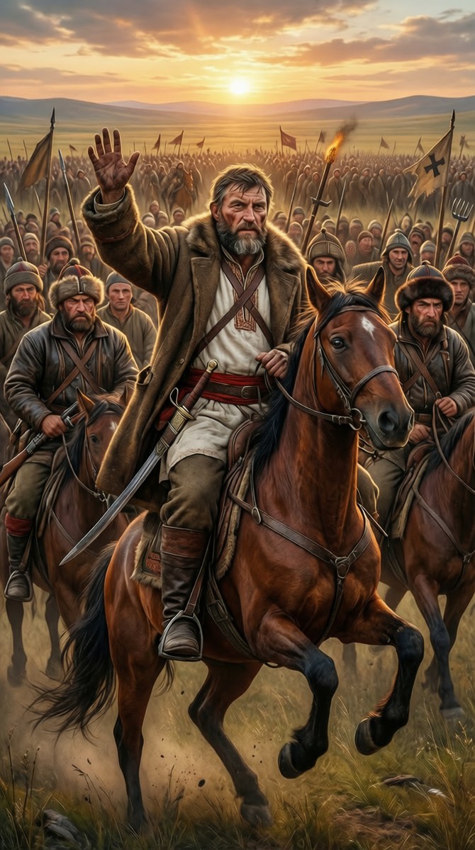 Пословица гласит: «Где казак, там и воля». Но что, если воля целого народа вздумала сокрушить трон? Представьте: разгар русско-турецкой войны, решается судьба Крыма. И вдруг — вся мощь империи разворачивается с южного фронта и бросается в глухие степи Поволжья и Урала. Против кого? Против «бунтовщика-самозванца» да его «сброда». Так нам часто говорят. Но история — она как река: на поверхности пенятся крестьянские волны, а мощное, невидимое течение — это казаки. Давайте спросим себя: а был ли Пугачев просто предводителем «голытьбы»? Или мы наблюдали казачью попытку затеять на просторах России свою, альтернативную гражданскую войну? Официальная история любит говорить о «стихийном восстании». Но империя действовала так, будто сражалась с равным противником. На войну с Пугачевым бросили лучшие полки, включая корпуса с польского театра. Историк Броневский пишет о 80-тысячной карательной армии. Добавьте сюда четырнадцать донских казачьих полков, отправленных «усмирять своих» — факт, который