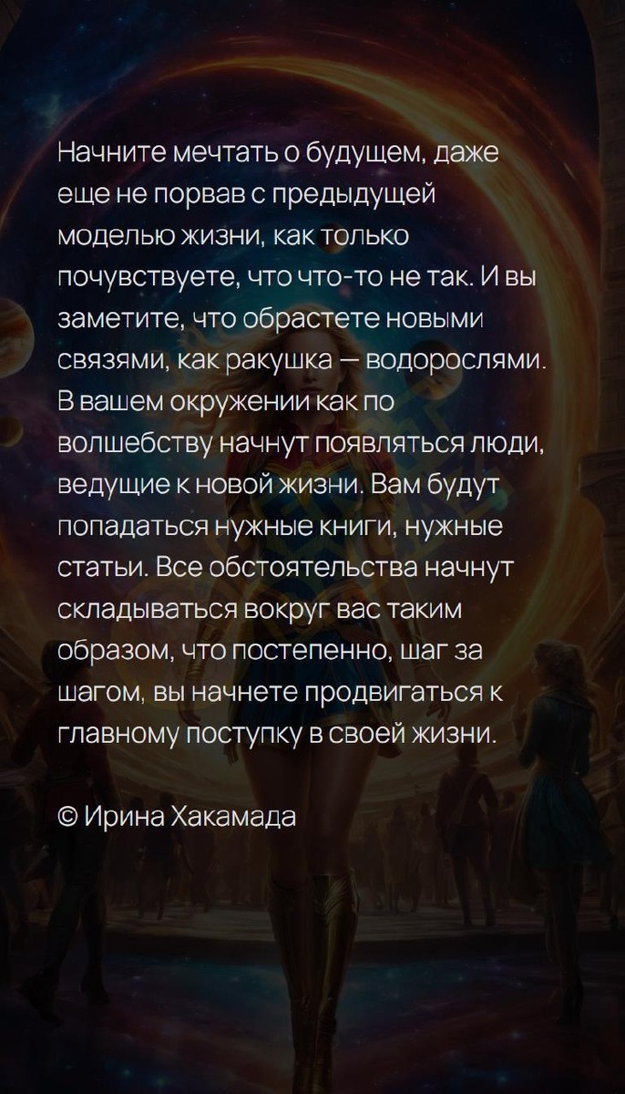 Начните мечтать о будущем, даже еще не порвав с предыдущей моделью жизни, как только почувствуете, что что-то не так. И вы заметите, что обрастете новыми связями, как ракушка — водорослями. В вашем окружении как по волшебству начнут появляться люди, ведущие к новой жизни. Вам будут попадаться нужные книги, нужные статьи. Все обстоятельства начнут складываться вокруг вас таким образом, что постепенно, шаг за шагом, вы начнете продвигаться к главному поступку в своей жизни. © Ирина Хакамада Архитектура вашей души | Архитектура вашей души T | VK | Pin | YouTub | Dzen #мирвнутри #встреча #клеткиздоровья #секретуспеха #твояреальность #светлыесилы #богатство #впотоке #встреча #4число #4февраля