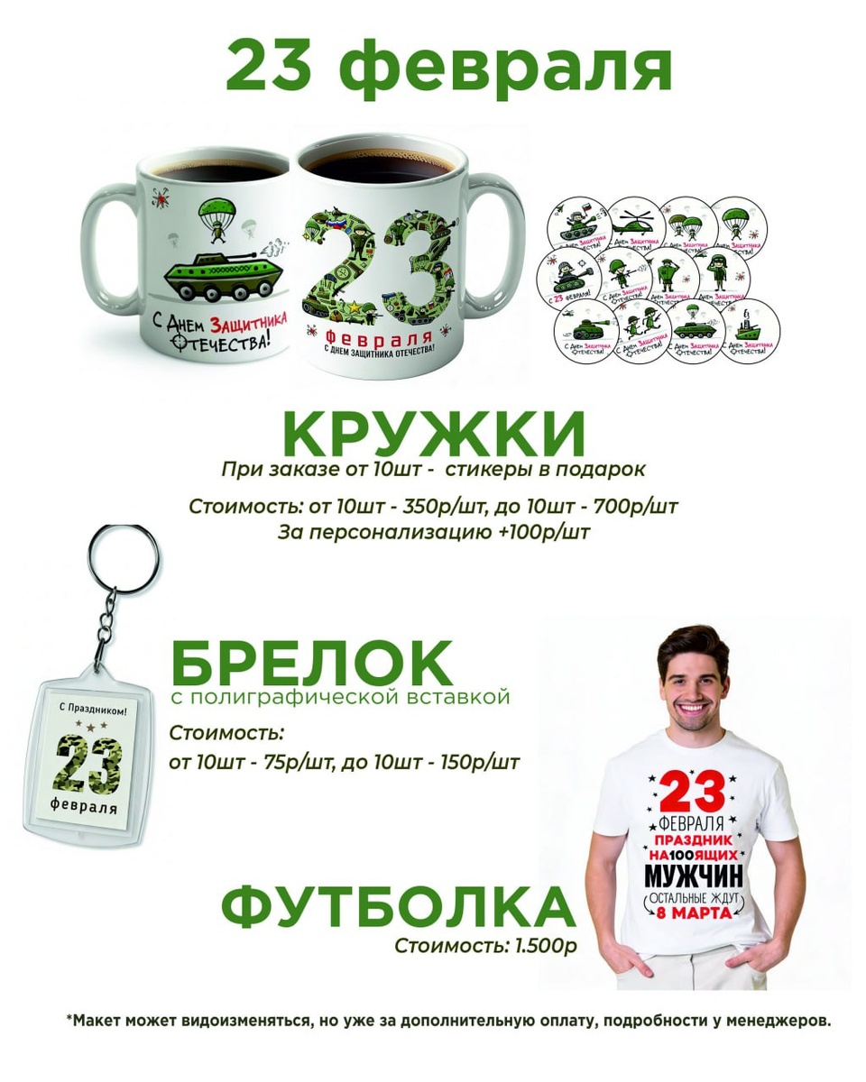 🎖 23 февраля уже близко — пора выбирать подарки! Практичные, с характером и с возможностью персонализации 👌 Мы подготовили подборку подарков ко Дню защитника Отечества: ☕️ Кружки — отличный вариант для коллег и команды 🔑 Брелоки с полиграфической вставкой — компактно и памятно 👕 Футболки — с тематическими принтами и возможностью доработки дизайна Подойдут для корпоративных поздравлений, классов, коллективов и личных подарков. Можно добавить имена, логотипы или внести правки в макет. 📩 Напишите нам — подскажем лучший вариант под ваш бюджет и сроки.