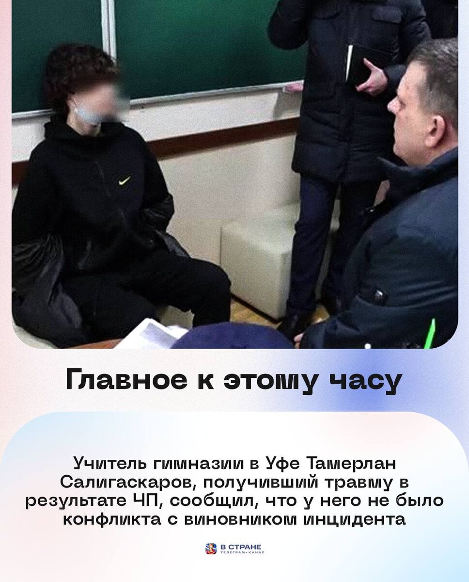 : 🔹Учитель гимназии в Уфе Тамерлан Салигаскаров, получивший травму в результате ЧП, сообщил, что у него не было конфликта с виновником инцидента. 🔹Перепись воробьев проведут в России в феврале. 🔹Переводить школьников в спецучреждения за буллинг предложили в Общественной палате России. 🔹Завозной случай лихорадки чикунгунья выявлен в России, сообщили в Роспотребнадзоре. 🔹В РФ появится ГОСТ на отделку квартир. 💰Курсы валют: доллар — 📉76,98; евро — 📉90,71; юань — 📈11,06. ✅ «В Стране» в MAX