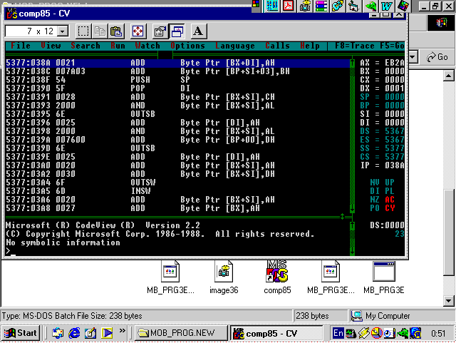 Загрузив старенькую 16-ти разрядную программку в отладчике Code View, а затем начав медленно (команда за командой) её выполнять, попадаешь в своеобразный мир компьютерного процессора. В нём все байты, которые есть в двоичном программном файле, превращаются в машинные команды процессора. Видя как процессор выполняет команду за команду языка ассемблера, как бы наглядно следишь за тем, как каждая выполняемая процессором команда, говорит о решении, которое принимает и делает твой компьютер.