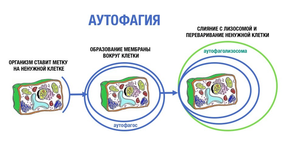" Звучит странно, согласна. Но по сути это один из самых важных механизмов омоложения нашего тела. Это процесс, при котором организм убирает клеточный "мусор" — повреждённые, старые элементы — и использует их как сырьё для создания новых, здоровых клеток. Такая внутренняя уборка напрямую связана с омоложением и долголетием. Надо сказать, что Ёсинори Осуми, получивший Нобелевскую премию за открытие аутофагии, был не в восторге от того, что всё свели к теме диет. Он-то изучал этот процесс на дрожжах и не утверждал, что аутофагия запускается только из-за голода. На самом деле она активируется и другими, более мягкими способами: — кратковременный температурный стресс - гормезис — регулярная физическая активность — полноценный сон Но есть нюанс — чем старше мы становимся, тем сложнее запустить аутофагию обычными средствами, нужны более сильные сигналы. И здесь на помощь приходят мои любимые нутри-инструменты: — лечебное голодание — интервальное питание 16/8 (его мы сейчас практику