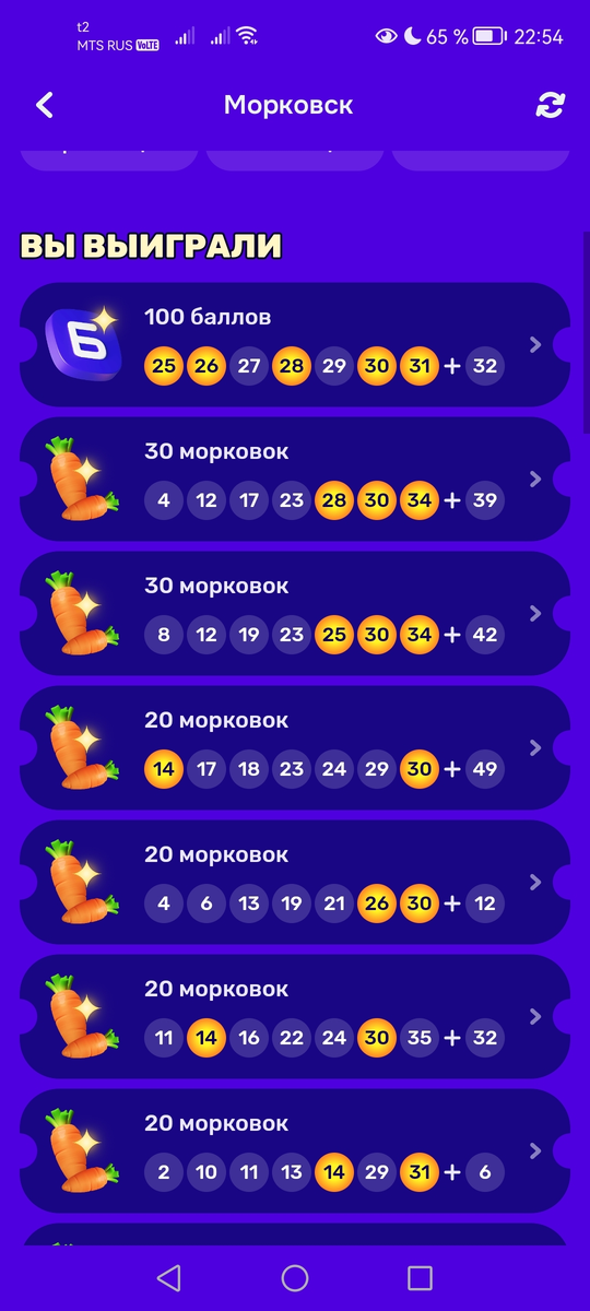 Чего-то меня это уже как-то даже пугать начинает. Ни копейки не было - и вдруг алтын. В общем Морковск затеял там какую-то новую тему с этими морковками, уже числе выбирать, типа пять из 45, только не 5, а 10 или даже 12. Суть в том что морковки у меня ребенок гоняет. Мне немножко лень, а упускать даже призрачные шансы на чего-то не хочется. И вот, совершенно внезапно, наблюдаю такое вот невероятное зрелище: Не, серьезно, уймищу морковок то я и раньше видал, морковки дело такое. Жаль что их в чаевые нельзя оставлять, кстати. Но нынче, то есть вчера, невероятное событие свершилось, притом второй же раз уже. В этом Морковске. Только в прошлый раз выигрыш был 30 баллов, а в этот раз - аж целых 100. Этак если дальше пойдет, то получается что дальше тыща, а потом миллион, а потом, может быть, и миллиард или даже. Или еще больше. Главное чтобы не морковок опять. Не, ну если кроме шуток и серьезно - как-то даже приятно. Главное что потратить сразу можно. Что, впрочем, уже. Пока не отобрали.