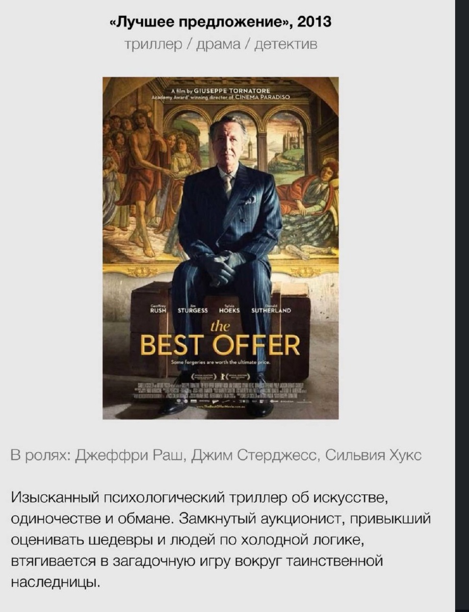 Украсть шедевр, продать подделку, обмануть экспертов - реальные случаи поражают смелостью, но художественное кино делает такие истории по-настоящему захватывающими. В галерее разные жанры - от лёгкого кино на вечер до картин, требующих вдумчивого погружения в зрительский опыт.