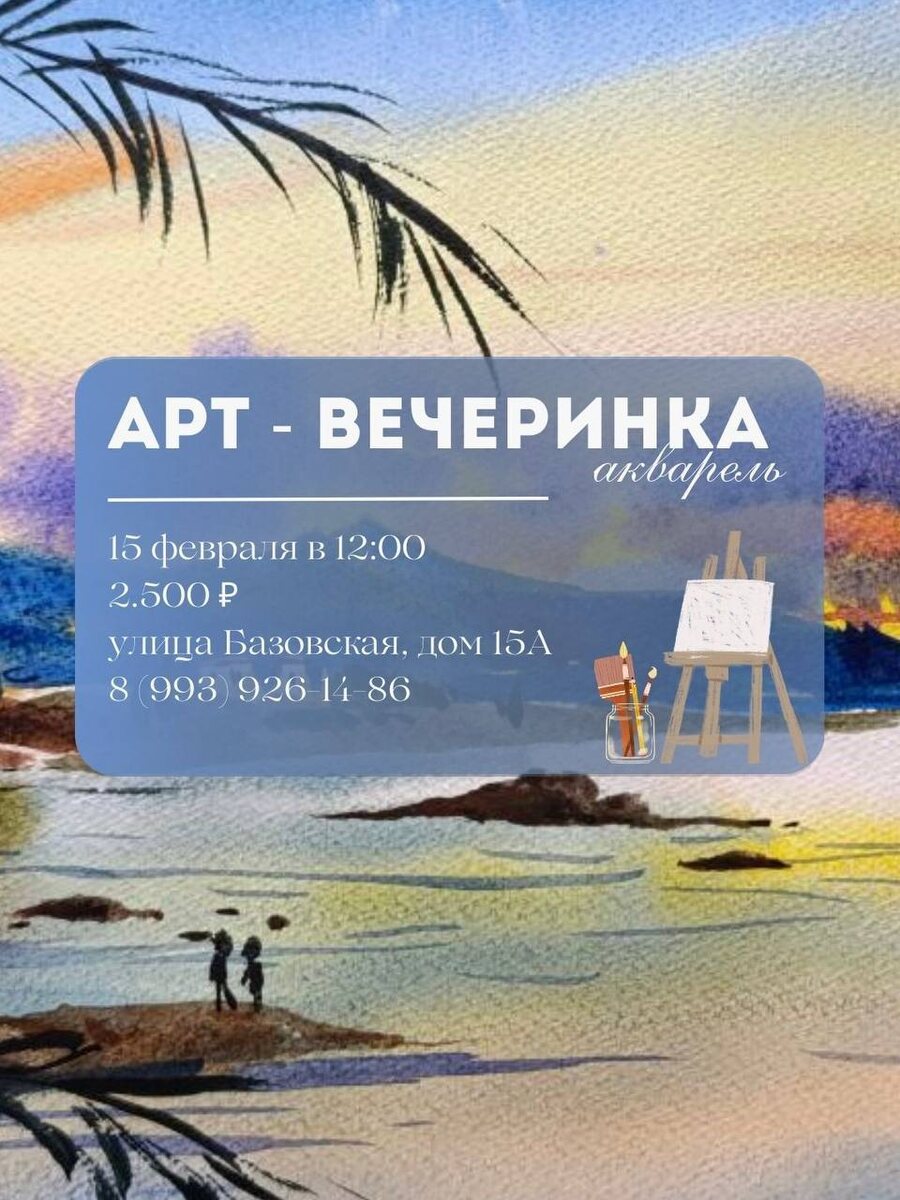 +❗️) 📅 Дата: 15 февраля 🕒 Время: 12:00 - 15:00 💵 Стоимость: 2500 ₽ На мастер-классе вы создадите уникальную картину акварелью 🎨 Что вас ждет: • Все материалы включены. • Бокал вина, чай или кофе для уютной атмосферы. • Общение с единомышленниками для обмена идеями. • Поддержка опытного художника для раскрытия вашего потенциала. Записывайтесь заранее, места ограничены. Ждем вас на арт-вечеринке, где каждый сможет стать художником 🎨 ___________________________ Для записи на занятия : 🤙 8 (993) 926-14-86 Наш сайт: http://www.anosotvorenie.ru