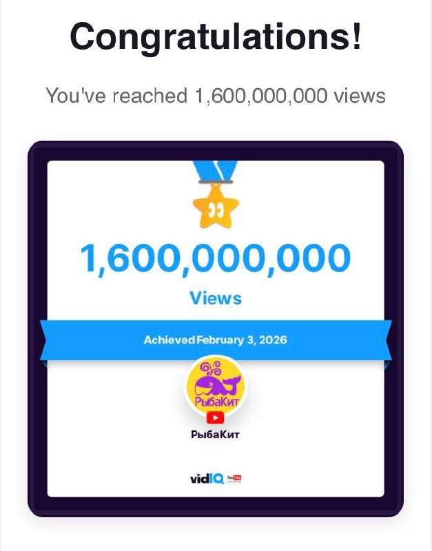 Ютуб поздравляет канал РыбаКит с 1,6 миллиардом просмотров 🤩