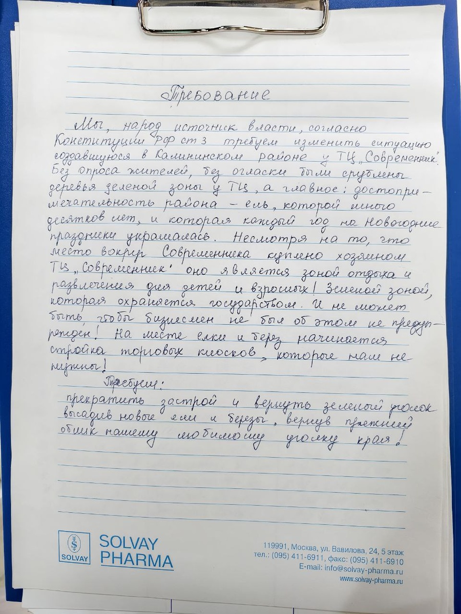 Мэрия разрешила застройку Жители Калининского района Новосибирска провели стихийную акцию протеста против вырубки деревьев у торгового центра на улице Объединения,27. Коллективное обращение за восстановление зелёной зоны подписали более 100 человек, сообщает журналист Виталий Бочкарёв. Три ели и берёзовую аллею вырубили в начале 2026 года. Местные говорят, что зелёная зона была частью общественного пространства ещё с 1970 годов. Администрация Калининского района утверждает, что «восстановительная стоимость» за снос деревьев «оплачена»: «Собственником участка оформлено официальное разрешение на снос деревьев под строительство». Как именно планируется застроить участок, чиновники не уточнили. Но «Сибирский экспресс» выяснил, что мэрия выдала разрешение на строительство магазина на соседнем с ТЦ участком. Хотя там и так стоит небольшой одноэтажный павильон, который, вероятно, скоро по проверенной схеме превратится в нечто большее. 📌 Разрешение на строительство выдано Анне Тимкиной