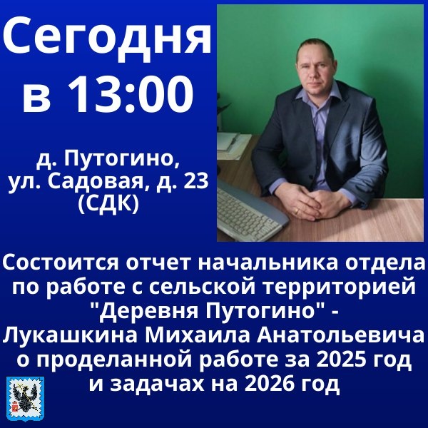 📢Друзья, сегодня в 13:00 состоится отчет начальника отдела по работе с сельской территорией "Деревня Путогино" - Лукашкина Михаила
