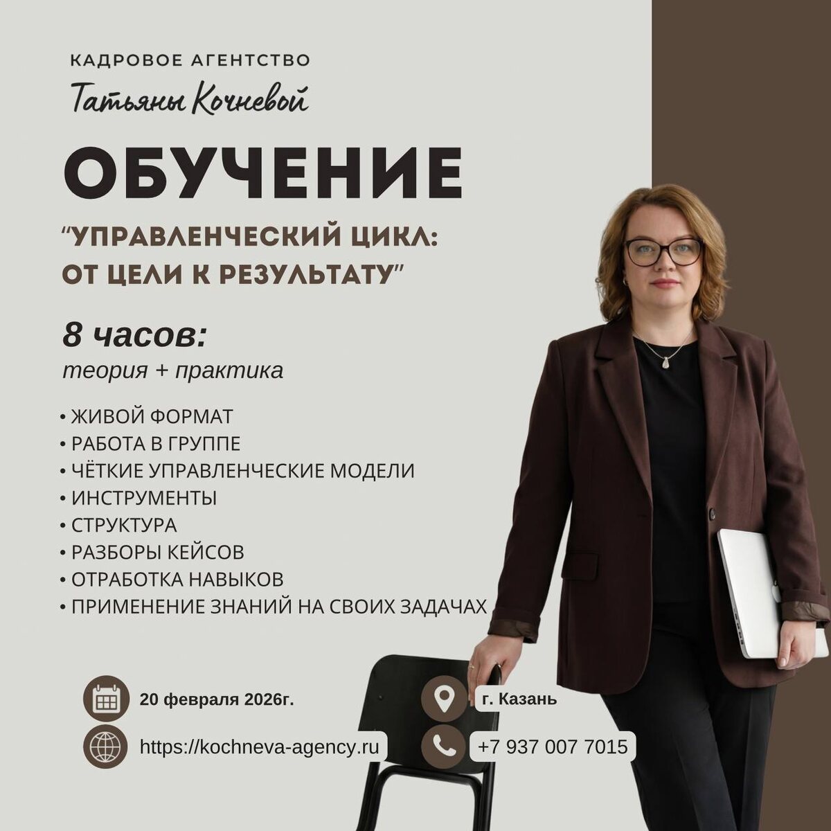 «Управленческий цикл: от цели к результату» Это обучение — не про мотивационные речи. Это про системное управление, когда цели действительно достигаются, а не «остаются на бумаге». Для кого это обучение: ▪️ руководителей подразделений ▪️ собственников бизнеса ▪️ тимлидов и руководителей команд ▪️ тех, кто вырос в управлении, но не проходил системного обучения Если: • цели ставятся, но не достигаются в срок • команда работает «на средней мощности» • руководитель тонет в операционке • контроль есть, а результата нет • обратная связь не приводит к росту сотрудников — это обучение для вас. Что вы получите: ✔ чёткое понимание 4 этапов управленческого цикла ✔ инструменты постановки достижимых целей ✔ рабочие методы контроля без микроменеджмента ✔ систему обратной связи, которая развивает сотрудников ✔ практику на реальных управленческих ситуациях Спикер: Татьяна Кочнева — основатель и руководитель кадрового агентства и HR школы, экс-HRD компании ООО «Связной», профессиональный HRD и HRB