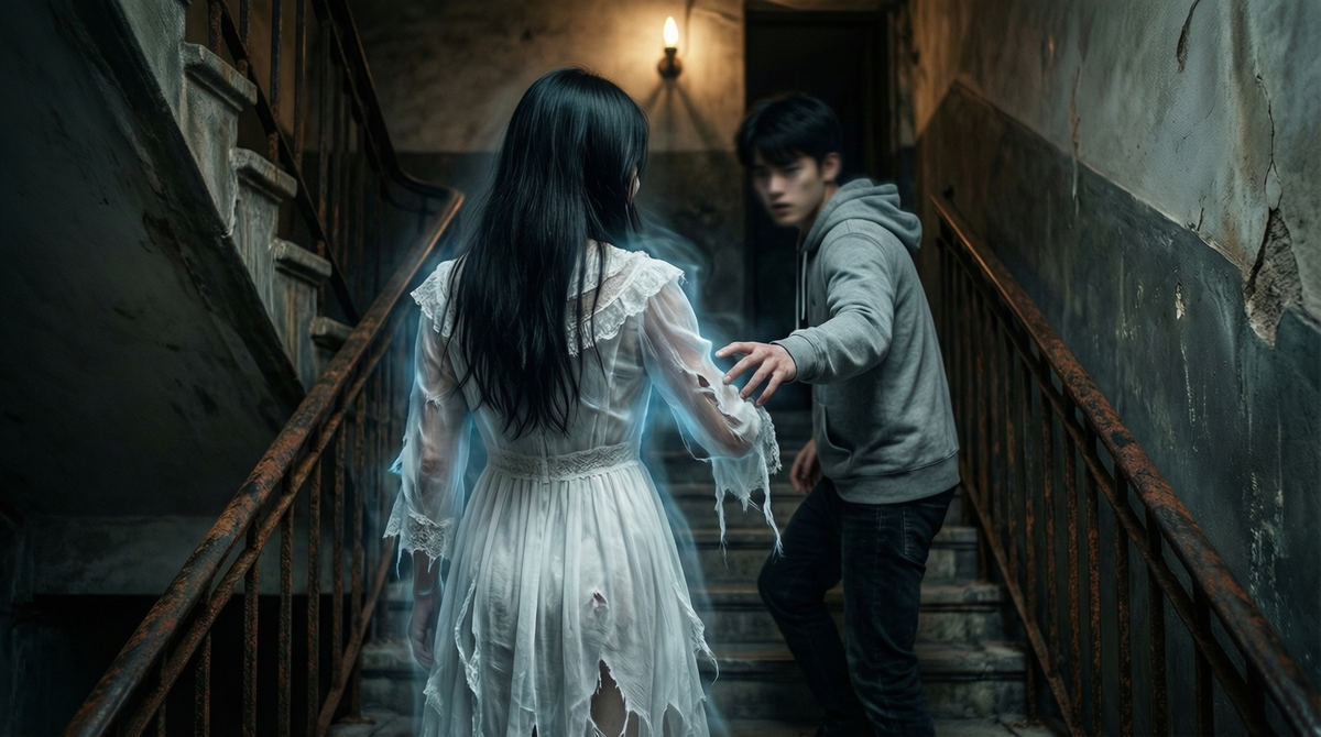 Прохладный воздух с лестничной клетки обжог лицо. Подъезд тонул в полумраке, лишь тусклая лампочка отбрасывала жёлтые, пляшущие тени. У перил, спиной к нему, стояла женская фигура в голубом пальто. Плечи её вздрагивали от беззвучных рыданий.