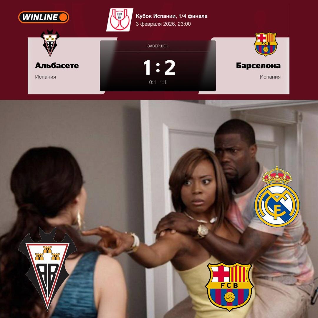 Барса отомстила Альбасете за мадридский Реал ⚫️🇪🇸 Каталонцы вышли в полуфинал Кубка Испании. Ямаль и Араухо нарисовали по голику. На 8️⃣7️⃣ минуте хозяева из Сегунды замахнулись на ремонтаду, но силёнок не хватило.