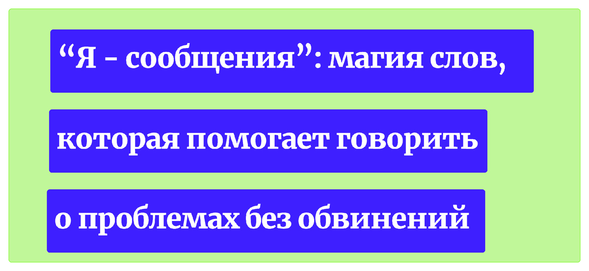 Использование «Я-сообщений» — это не риторический трюк. Это внешнее проявление внутренней установки: «Мои чувства важны, твои чувства важны. У нас есть проблема, а не ты — моя проблема. Я доверяю тебе достаточно, чтобы показать свою уязвимость, и уважаю тебя достаточно, чтобы не атаковать».