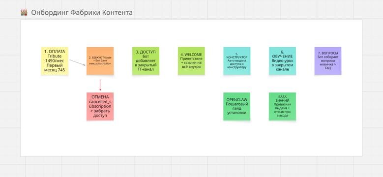 План собрать воронку. Немного парит tribute подписка на фабрику, но сервис удобный. Хоть и забирает 10% – очень хорошо обрабатывает платежи. Грамотно мониторит продление, активации и т.д. Но это чисто платный закрытый канал. Мне нужно больше функционала. Я могу собрать на Salebot похожее по направлению закрытого канала, но все равно будет нужен контроль или тех.спец. Постоянно что-то будет отваливаться. Слетать оплаты и т.д. Пока останусь, тем более они обещали внедрить функционал... CRM, бота который может догревать и догонять и курсы, где я смогу нормально развернуть базу знаний. А пока голову ломаю – буду соединять два сервиса. Оплачиваешь фабрику, тебя подхватывает бот по вебхуку. Видит, что ты платный, не заяц. И уже тога можно к нему сходить, получить доступ к github конструктору, получить навигацию по урокам, эфирам... подумаю ИИшку прикрутить на ответы на вопросы... Почему не иду в полноценную онлайн школу? Не хочу, чтобы люди прыгали туда-сюда. Одна экосистема в телег