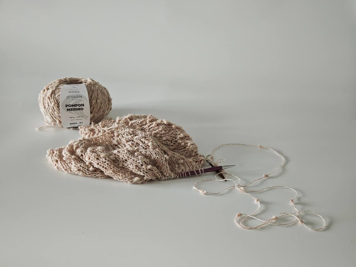 Вы просто вяжете лицевой гладью, а получаете сложное, объёмное полотно с ритмом пушистых помпонов. Что получается на выходе: 1. Равномерные помпоны создают идеальный орнамент сами по себе. Ваша задача — просто вязать. 2. Умный дуэт в составе. Хлопок (для лёгкости и облегания) + меринос 19 микрон (для тепла и мягкости). Изделие не будет колючим и при этом согреет. 3. Палитра «Cloud» — нежные, приглушённые тона ручной окраски. Цвет ложится мягкими переходами, добавляя глубины даже простой форме. 4. Выгодный расход. Всего 230 грамм (это 2-3 мотка) на размер 46-48. Эффект дорогой дизайнерской вещи.
