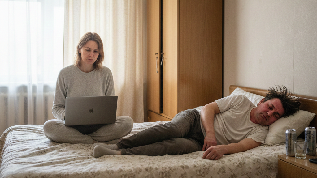 «Живем 10 лет. Три года как он пьет ежедневно. Вечером — 5-6 банок пива, в выходные — водка. Я перепробовала все: деньги прятала, бутылки выливала, скандалила, молчала, умоляла на коленях. Звоню ему на работу, вру начальнику, что он заболел, чтобы не уволили. Сама плачу ипотеку, потому что его зарплата уходит на пойло. Контролирую каждый шаг, проверяю карманы. Подруги говорят: отпусти ситуацию. Но как отпустить, если у нас кредиты и дети?»