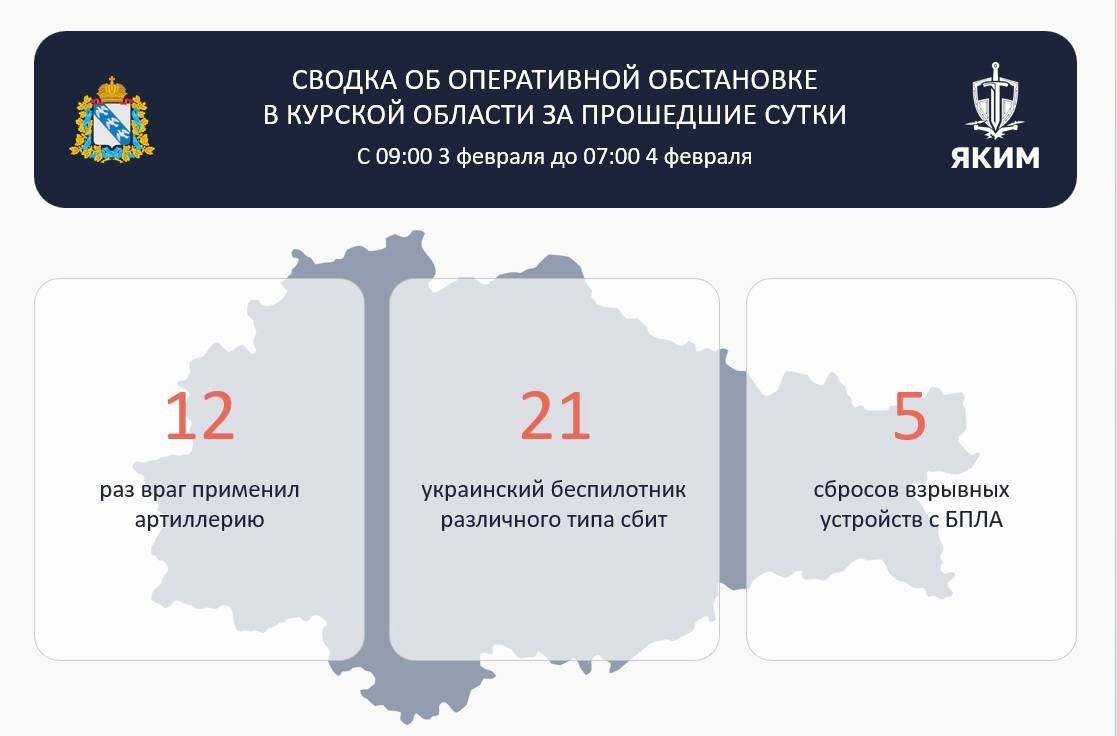 Сводкой за период с 9.00 3 февраля до 7.00 4 февраля поделился губернатор Александр Хинштейн. За 22 часа в регионе сбит 21 вражеский беспилотник различного типа. 12 раз противник бил по приграничью артиллерией. Пять раз с БПЛА сбрасывали на курскую землю взрывные устройства. При атаке в посёлке Хомутовка Хомутовского района посечён забор домовладения. Глава региона подчеркнул, что погибших и пострадавших нет. Фото из соцсетей Александра Хинштейна. «ГИ» в ТГ | МАХ | ВК. Подписывайтесь! ✔️