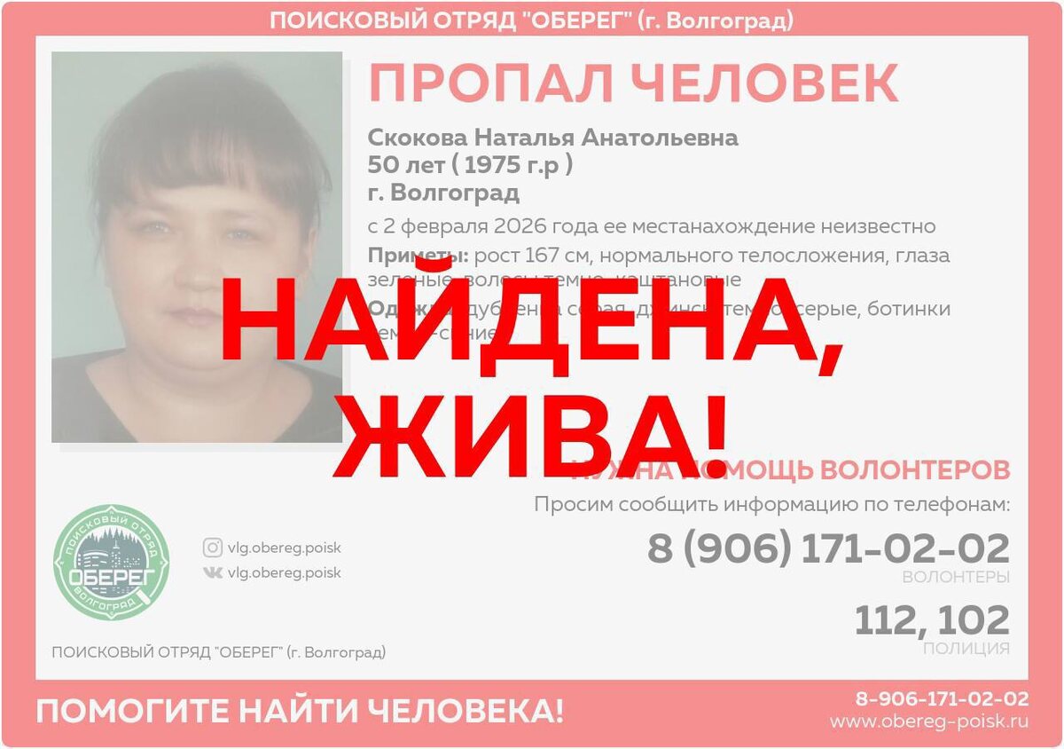 ! #Скокова Наталья Анатольевна Увидели пропавшего? Просьба сообщить об этом на круглосуточную горячую линию 8-906-171-02-02 ❗Помогите распространить ориентировку во всех соцсетях и мессенджерах! 📌Наши контакты : https://taplink.cc/obereg_poisk