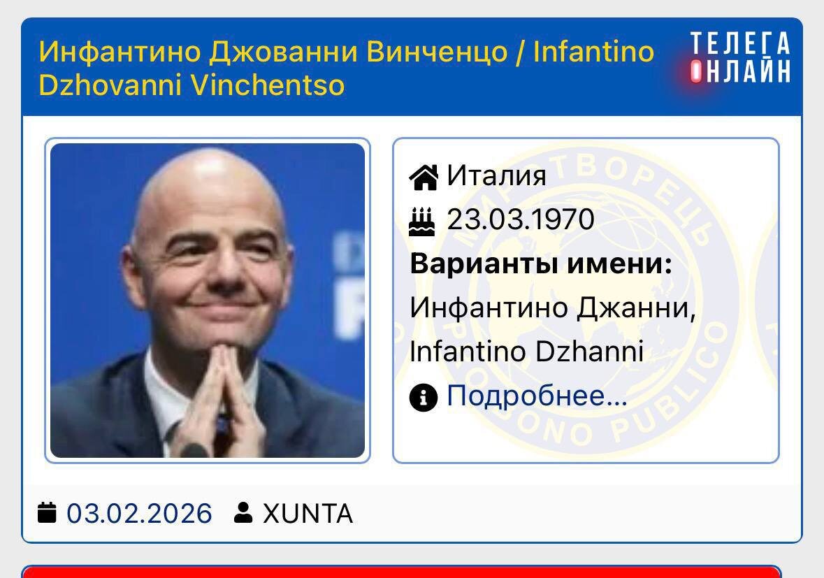 Президент ФИФА Джанни Инфантино, ранее заикнувшийся о бесполезности отстранения российских команд от международных турниров, внесен в базу экстремистского сайта «Миротворец». Мы все еще удивлены, почему Незалежная не потребовала от ФИФА просто засчитывать ей победу во всех матчах. 🚲 Подпишись на Телега Online