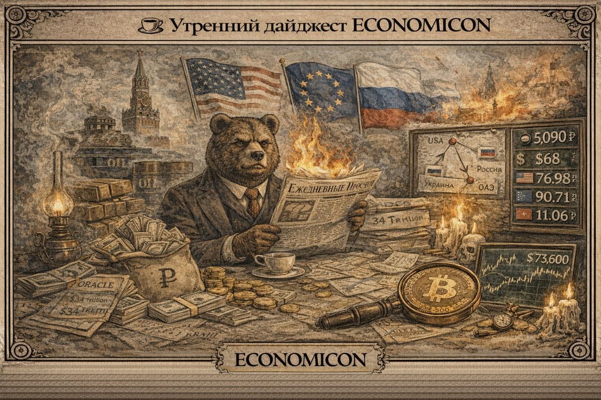 ! На связи утренний дайджест Economicon 😎 Мир стабилен. Просто всё горит ровным пламенем. 💱 Валюта и сырьё на сегодня $ — ₽76,98 € — ₽90,71 ¥ — ₽11,06 Gold — ~5090 Brent — ~68 🏛 Минфин РФ продолжает размещать ОФЗ. И снова около 80 ярдов на этой неделе. Деньги нужны всем, всегда и срочно — ничего нового. Переговоры РФ–США–Украина снова пройдут в ОАЭ. Формально — диалог, фактически — проверка, кто первый устанет. 📉 Российские акции Whoosh — инсайдерам запретили шевелиться. ЮМГ — допэмиссия, как способ вспомнить, что акционеры тоже люди. Софтлайн и ВИру — операционные результаты. Смотрим с интересом. 🇺🇸 Америка Госдолг США растёт строго по расписанию. Надёжнее швейцарских часов. Домохозяйства США вложили рекордные 47,1% капитала в финансовые активы. Исторически это всегда очень «вовремя». 🛢 Нефть и геополитика запасы нефти в США неожиданно сократились. Рынок улыбается. Иран снова в переговорах — теперь в Омане. Сначала дипломатия, потом объяснят, почему она не сработала. Инд