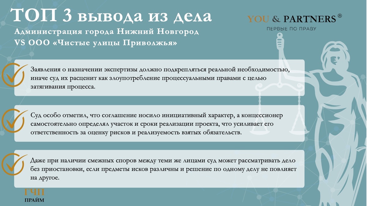 Команда You & Partners проанализировала решение Арбитражного суда Нижегородской области по делу №А43-19152/2024. 🟢 Суть спора: Администрация города Нижнего Новгорода обратилась в суд с иском о досрочном расторжении концессионного соглашения №57 от 22.12.2022 о реконструкции и эксплуатации станции снеготаяния и о возврате переданного имущества. Основание — существенные нарушения условий соглашения со стороны концессионера (ООО «Чистые улицы Приволжья»). Позиция сторон: 🤚Истец (Администрация): утверждал, что концессионер допустил существенные нарушения, делающие невозможным дальнейшее исполнение соглашения. 🤚Ответчик (ООО «Чистые улицы Приволжья»): ссылался на отсутствие своей вины в срыве сроков, утверждал, что администрация не передала необходимые документы, и ходатайствовал о назначении экспертизы и приостановлении дела. Суд удовлетворил иск администрации, признав нарушения существенными и приведшими к невозможности исполнения соглашения: 🟢 Согласно соглашению, работы должны были