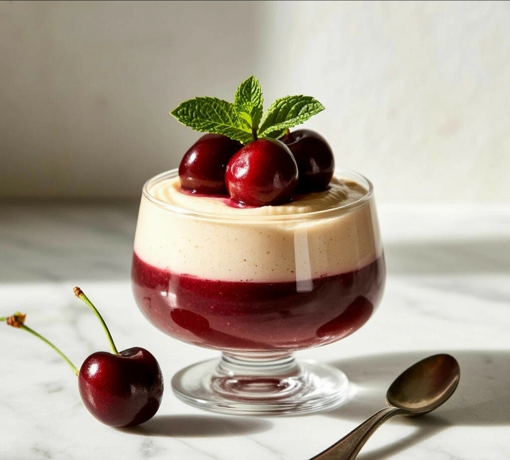 8. 😻 Подаём! Перед подачей можно украсить десерт свежей вишней, мятой, шоколадной крошкой или просто полить сверху ещё немного вишнёвого кули. Лёгкий, нежный, с приятной кислинкой — идеальный финал сытного дня! 🍽️