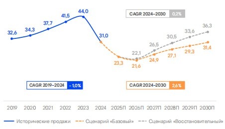 ». В исследовании «Обзор рынка спецтехники в России» эксперты приводят два сценария для российского рынка СХТ — базовый и восстановительный. ❗️ Оба включают дальнейшее сокращение объема рынка в 2026 году. ▪️ Базовый сценарий предполагает, что по итогам 2025 года объем рынка составит 23,3 тыс. шт, а в 2026 году рынок достигнет низшей точки в 21,6 тыс. шт. После этого в 2027 году можно ожидать восстановления до 24,9 тыс. шт, а к 2030 году объем отгрузок вырастет до уровня 2024 года — 31,4 тыс. шт. Для реализации этого сценария необходимо сохранение текущих мер господдержки и темпа локализации производств. ▪️Восстановительный сценарий также предполагает, что рынок в 2026 году "достигнет дна" на уровне 22,1 тыс. шт. Однако к 2030 году удастся превысить показатели 2020 года — объем рынка составит 36,3 тыс. шт. Более быстрое восстановление рынка может обеспечить повышение рентабельности аграриев, увеличение объема господдержки и активная локализация производств в России. 🤝 За наводку