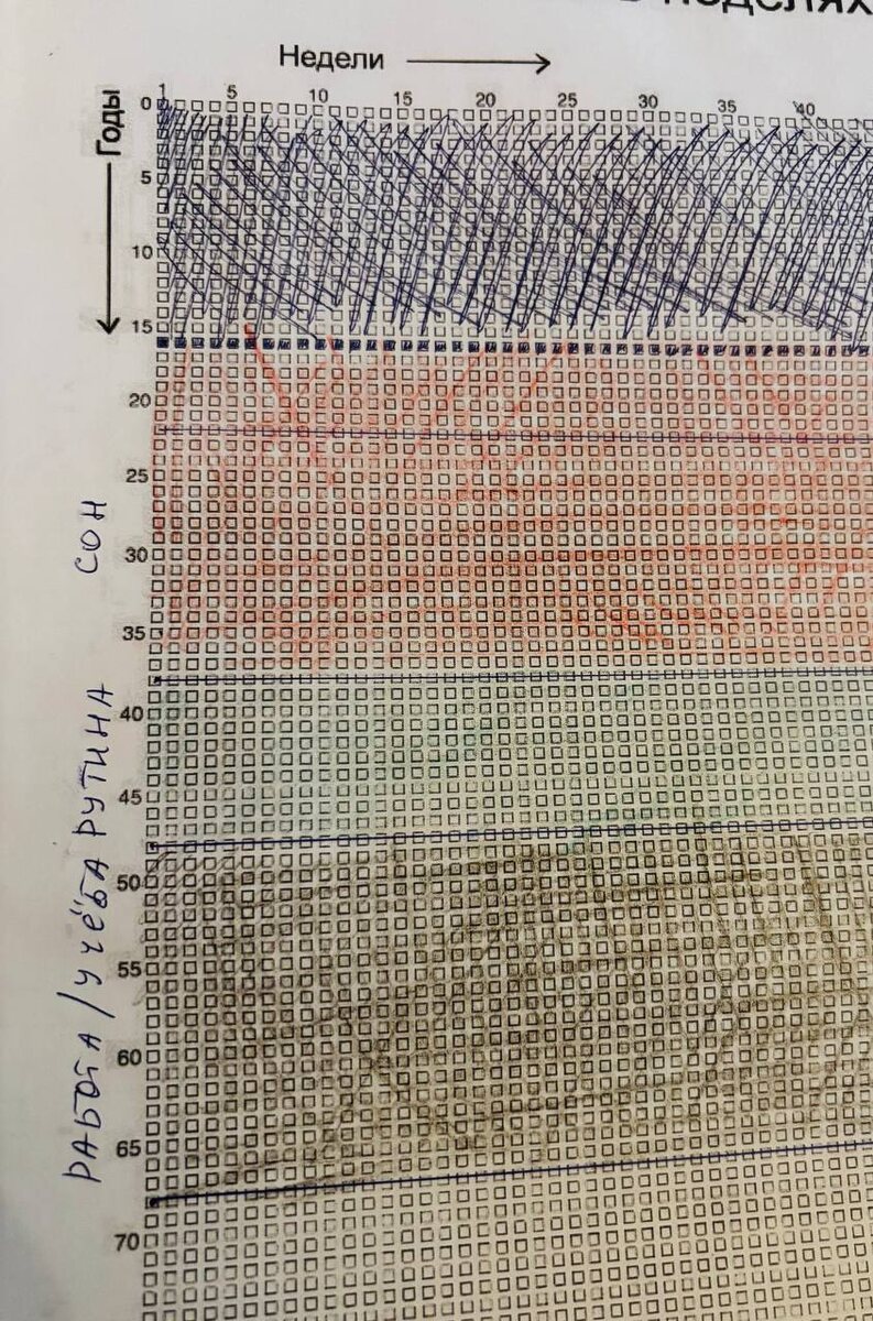 ! 🌸 Закончила работу с групповыми курсами оффлайн для подростков. Разработала различные приемы для повышения учебной мотивации, планирования, постановки целей, алгоритма шагов, профилактики гаджетозависимости и многое другое. В процессе работы выбрала самые эффективные приемы, которые буду пошагово выкладывать здесь. Пользуйтесь! 🌸 Начнем с приема «80 лет в неделях. Пирамида жизни». ✅Распечатайте таблицу на А4. (В сети есть несколько вариантов. Например, «90 лет в неделях». Ее тоже можно использовать. Но я предлагаю 80 лет, потому это ближе к российской статистике продолжительности жизни). 💙Приготовьте цветные карандаши/ручки/фломастеры. 😈Предложите ребенку отсчитать уже прожитые им годы и закрасить их (отдельно каждый квадратик закрашивать не нужно. Отмечаем линейкой нужный уровень, проводим линию и прокрашиваем полностью полученный прямоугольник). Это годы, которые ребенок уже прожил. 💙Далее идут вопросы: «Как ты думаешь, на что человек тратит больше всего времени?» Конеч