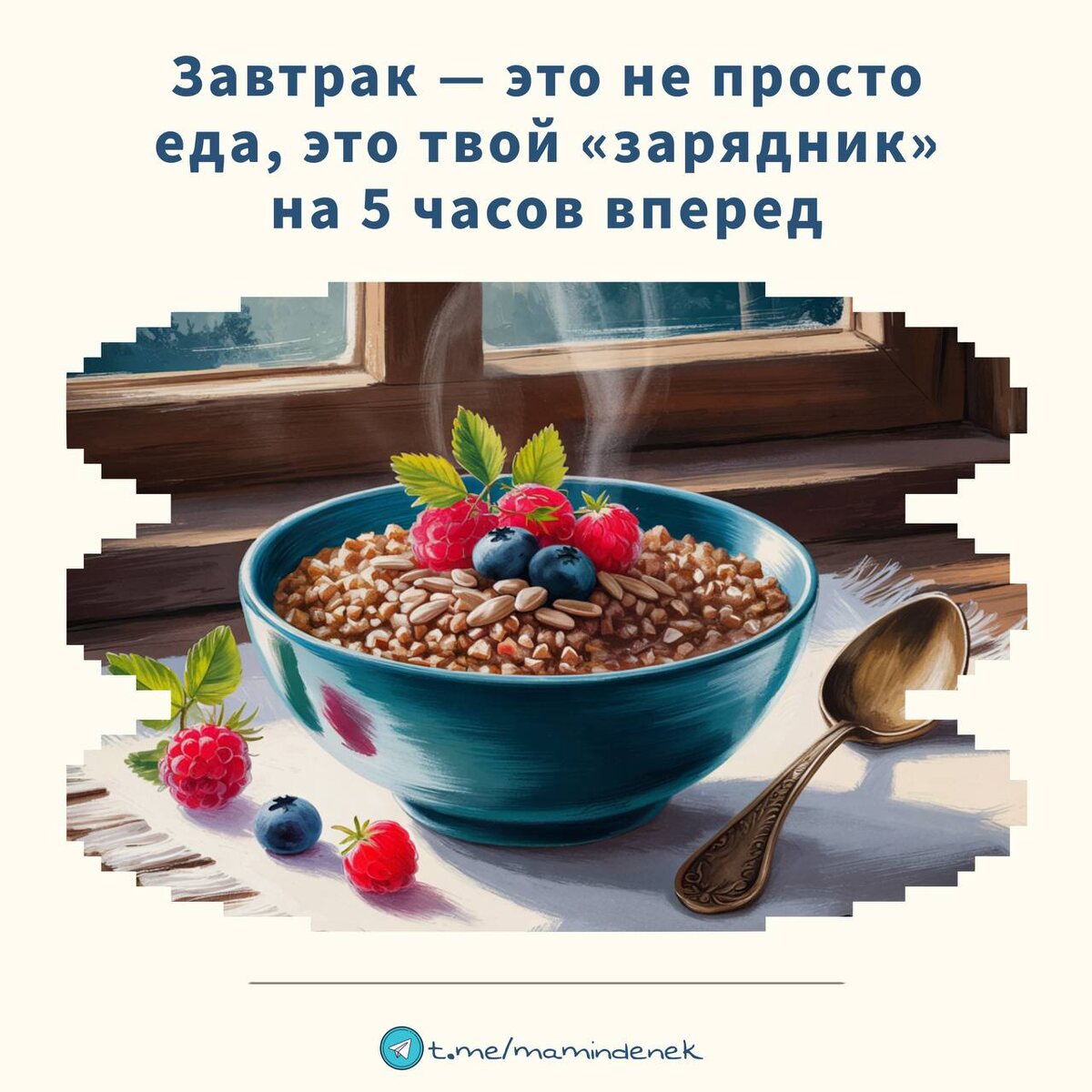 сладкое. 💚Лови 10 простых конструкторов завтрака из того, что уже есть у тебя в холодильнике. Минимум кулинарии — максимум пользы для тебя и стабильной нервной системы для детей. 1️⃣. Классика белка: Яйца (2 шт) + ЦЗ хлеб с маслом + свежие или ферментированные овощи. 2️⃣. Творожный микс: Творог (5–9%) + ягоды + овсянка долгой варки + горсть семечек. 3️⃣. Завтрак-пятиминутка: Домашнее запеченное мясо( буженина) / отварной язык (сделай заранее) + хлебцы с маслом + овощные палочки (дети их обожают). 4️⃣. Сытный «Походный»: Каша (гречка/рис) с маслом + рыба (консервы в собственном соку) + зеленый горошек/фасоль. 5️⃣. Овощной омлет: Яйца с миксом овощей + тертый сыр + цельнозерновой тост. 6️⃣. Азиатский вайб: Рис с маслом + вареное яйцо + порция свежего салата. 7️⃣. Паштет & Каша: Печеночный паштет (или хумус) на ЦЗ хлебе + любимая крупа + овощи. 8️⃣. Десертный завтрак: Вафли без сахара + греческий йогурт + много ягод и орехи. 9️⃣. Плотный старт: Запеченный картофель + слабосоленая рыба и