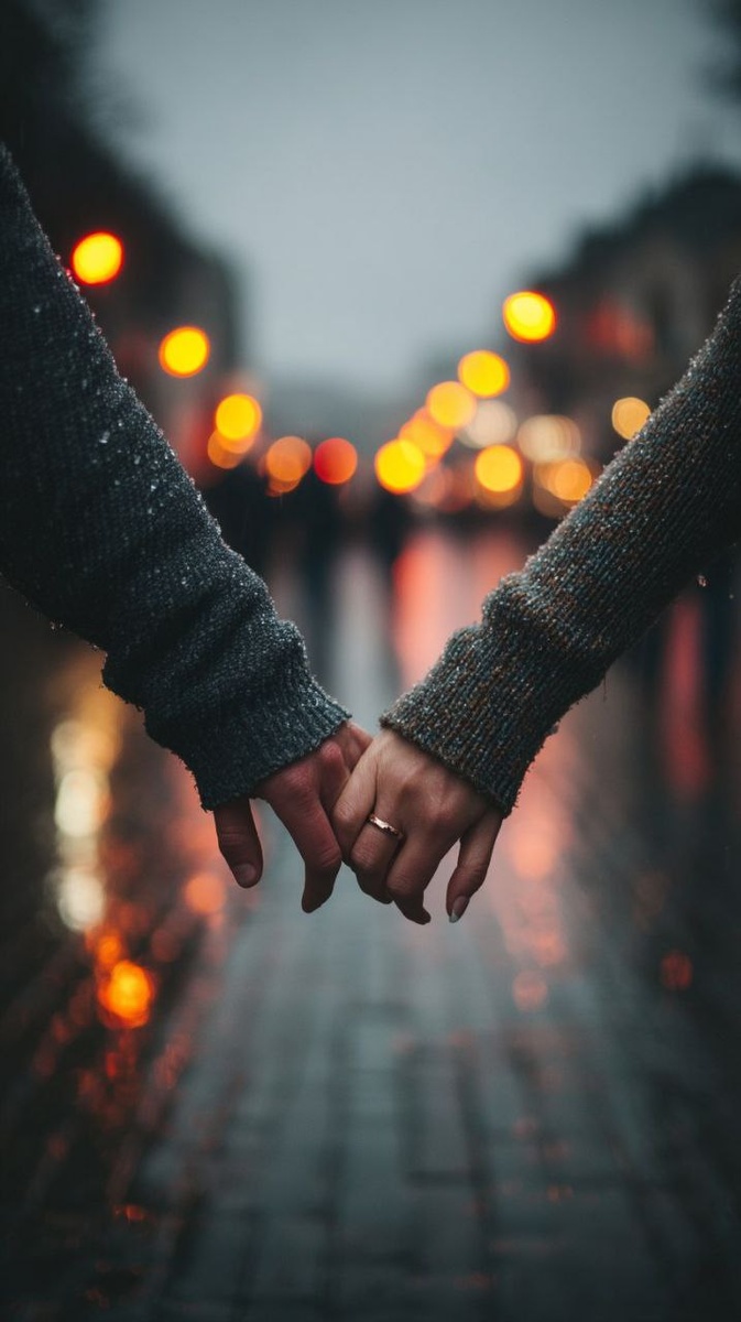 Couple aesthetic, no faces: close-up of two hands gently intertwined while walking, wet pavement after rain, reflections of street lights, sleeves touching, subtle rings, shallow depth of field, cinematic bokeh, 35mm film look, soft grain, moody romantic atmosphere, natural candid moment, high-end editorial photography --ar 9:16 --style raw --s 250 --q 2 --no faces, eyes, readable text, logos, watermark 2) Кофе “на двоих” у окна Couple aesthetic, no faces: two takeaway coffee cups held close together, fingers warming the cups, window light, winter morning haze, soft steam, cozy knit sleeves, minimal background, intimate calm mood, cinematic lighting, 50mm, ultra realistic, editorial lifestyle photo, fine film grain --ar 9:16 --style raw --s 300 --q 2 --no faces, eyes, readable text, logos, watermark 3) Шаги в унисон (низкий ракурс) Couple aesthetic, no faces: low-angle shot of two people walking side by side, synchronized steps, shoes and hems of coats, fallen leaves, golden-hour b
