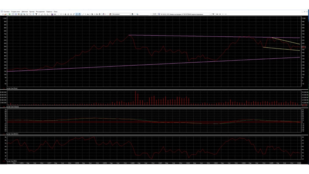 Как видим, из новостного фона и выплаты дивидендов в январе 2026 года, инвесторы поддерживают акцию Татнефть (п) на российском фондовом рынке. Поэтому акция пользуется популярностью, не все компании готовы выплачивать дивиденды своим акционерам, хотя они по своей популярности не уступают акции Татнефть (п). Исходя из этого, с помощью технического анализа рассмотрим динамику движения акции до конца марта 2026 года.